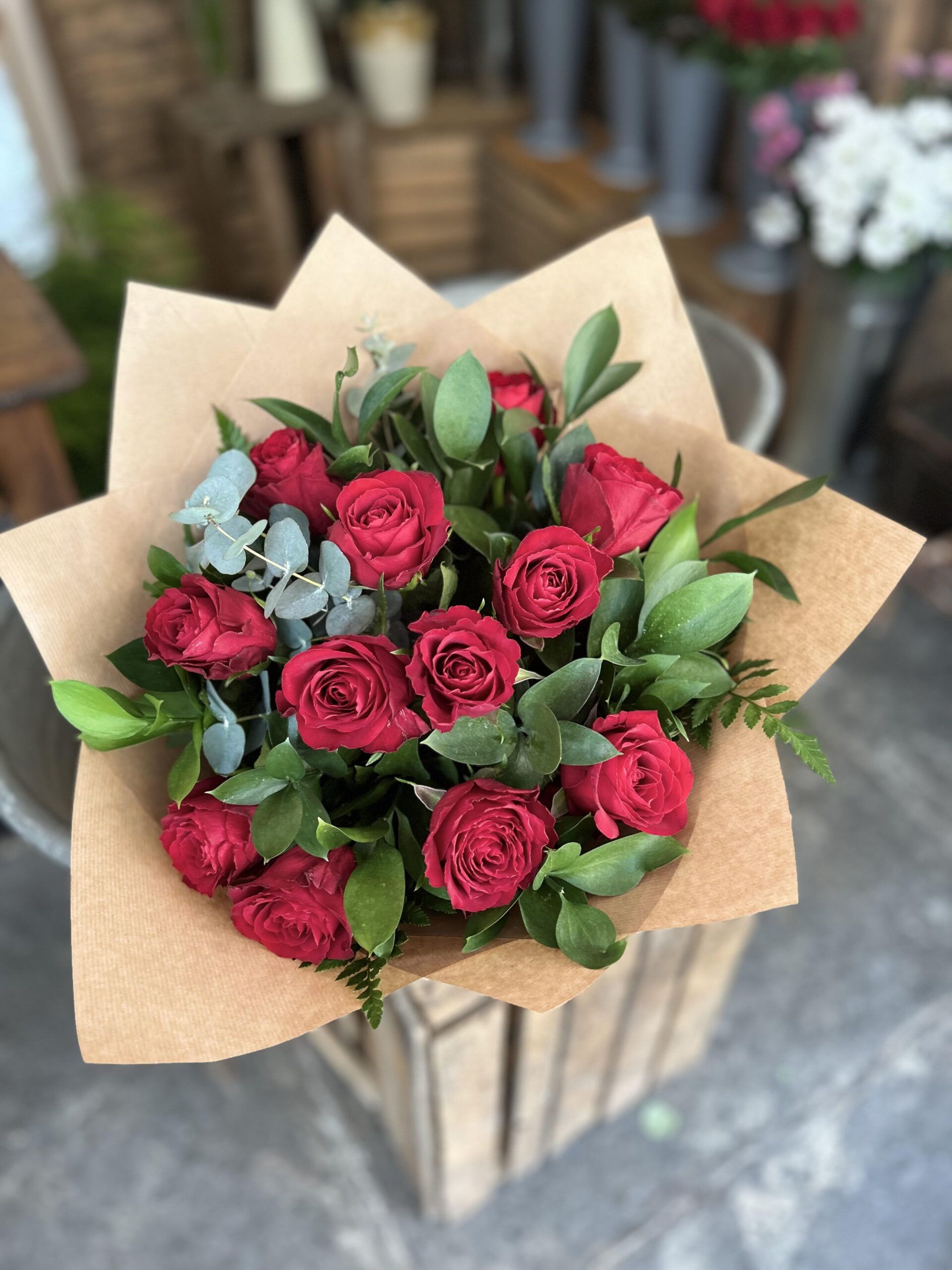 One dozen red roses with pretty foliage, hand tied and simply wrapped with Kraft paper and tied with a red ribbon.